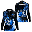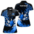 Damen Bowling Polo Shirt - Personalisiertes Blau Flammen Bowlingkugel und Pins Team Liga Bowler Trikot Q6977