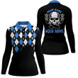 Schwarzes und blaues Argyle-Muster Bowling Skull individuelle Bowling-Polo-Shirts für Frauen, Bowling Trikots Q6917